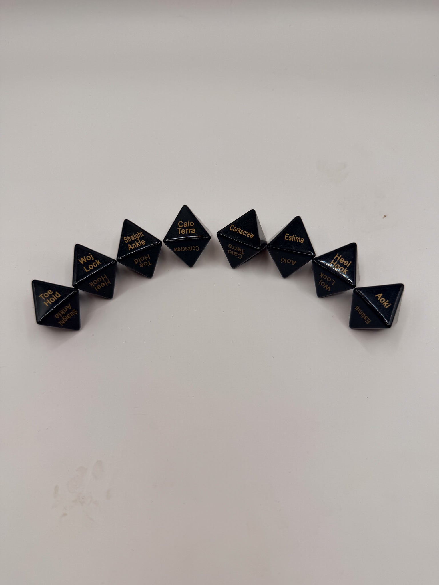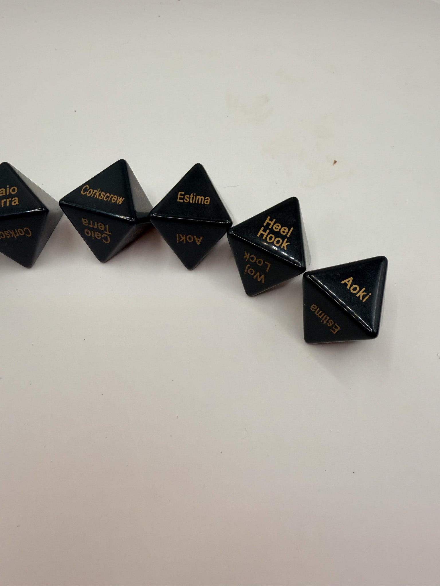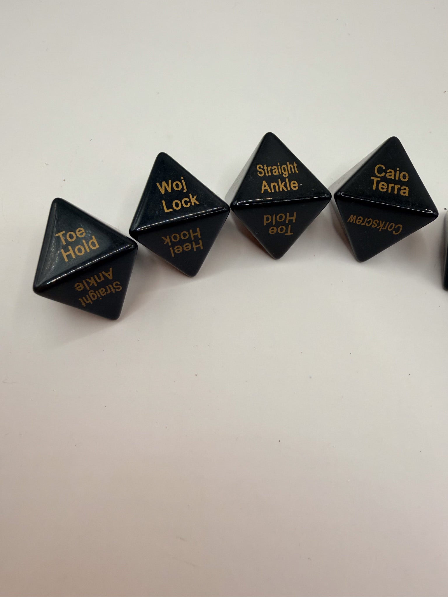 - 2x Submission Dice (Black/Gold):Ā Each player rolls one to get theirĀ submission objectiveĀ (Heel Hook, Corkscrew, etc).